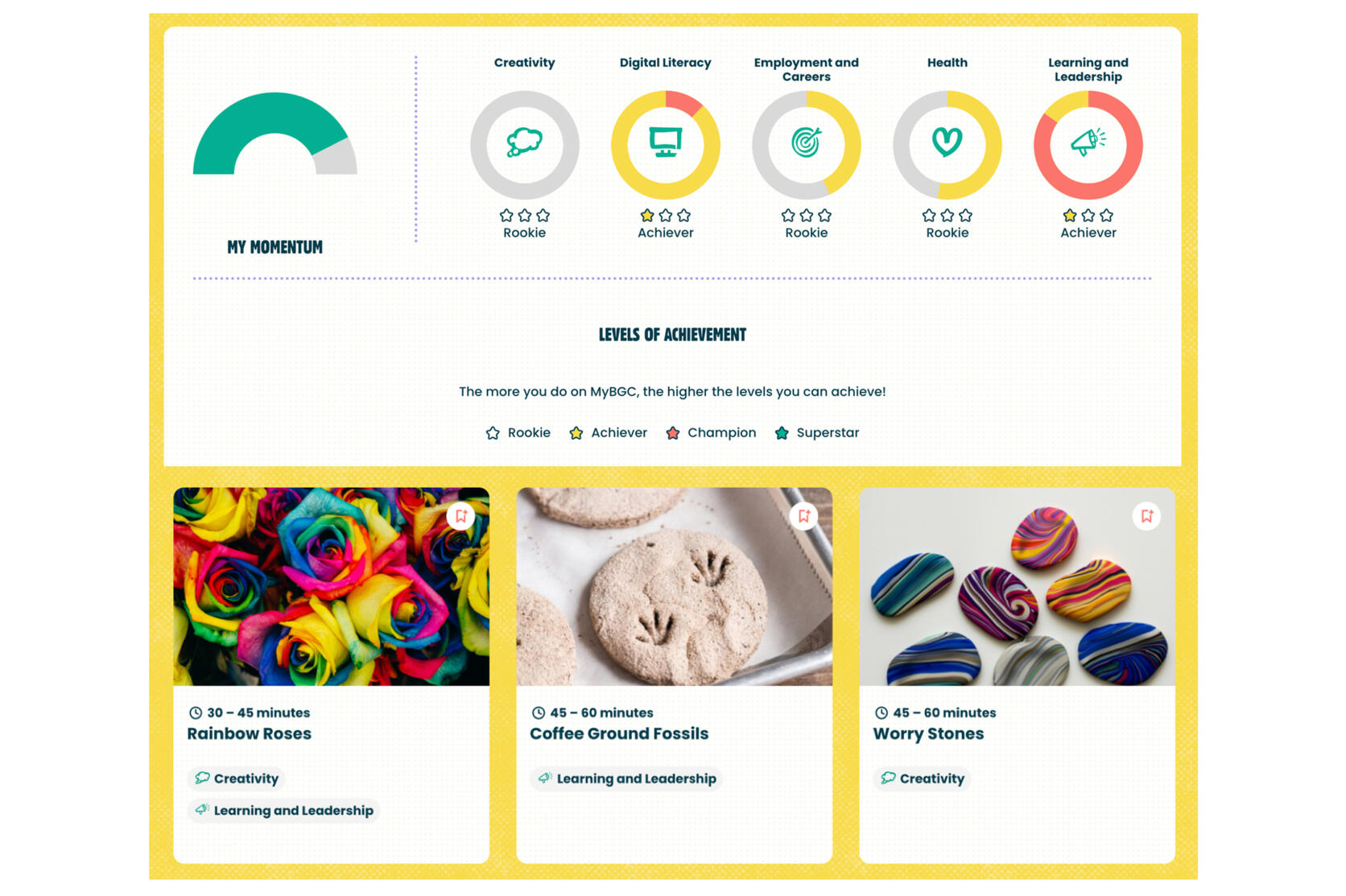 As Canada's largest dedicated child- and youth-serving organization, BGC clubs help kids and teens develop the skills they need to succeed. The MyBGC online learning platform is a critical part of this work, providing comprehensive training to staff and volunteers, as well as an accessible and safe educational platform for youth.I designed and developed multiple e-Learning programs utilizing the ADDIE method and employing best practices for both andragogy and pedagogy—adjusting voice, tone, and content based on whether the learning audience was intended for youth or adult audiences.